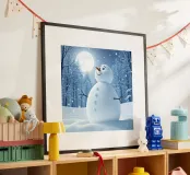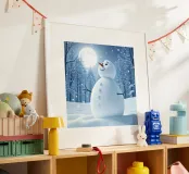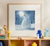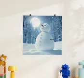 Un pupazzo di neve si gode la notte invernale, circondato da una foresta innevata illuminata dal bagliore della luna piena, creando un'atmosfera serena e magica.
