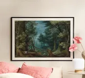 Un paesaggio forestale con cacciatori che inseguono un cervo poster con telaio in alluminio