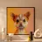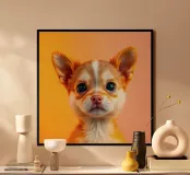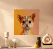 Un simpatico cucciolo di chihuahua con gli occhi grandi posa contro una vivace o poster con telaio in plastica