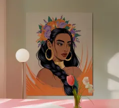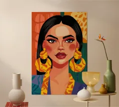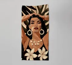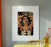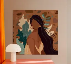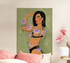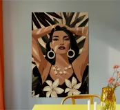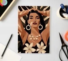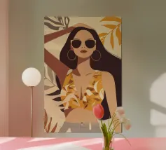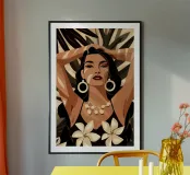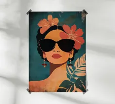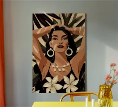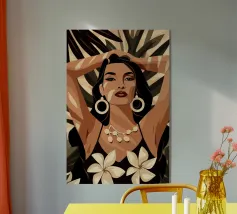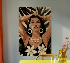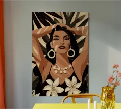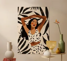 Questo poster espressivo combina la sensualità tropicale stilizzata con la raffinatezza grafica. Con potenti tonalità beige boho e contrasti netti, ricorda l'estetica dell'Art Déco e le illustrazioni iconiche della moda. La posa sicura e i dettagli floreali aggiungono fascino e forza al motivo: una dichiarazione femminile esotica ed elegante. Ideale per ambienti moderni e per chi ha un senso di stile e di vagabondaggio: una volta nei mari del sud, non si torna più indietro.