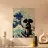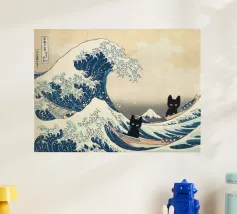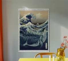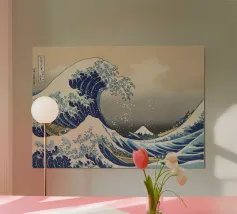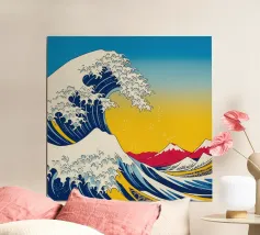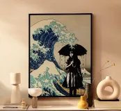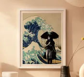 "In questo intelligente collage, l'iconica Grande Onda al largo di Kanagawa viene reimmaginata con un tocco di arte urbana, incorporando lo stencil di una ragazza che si ripara sotto un ombrello proprio sotto l'onda. La fusione di stili tradizionali e moderni dà vita a un'opera dall'estetica pop e street art, dove l'interazione tra l'onda gigante e la figura calma della ragazza crea un'intrigante narrazione visiva."