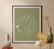 "Universal Self" è un'accattivante opera d'arte lineare verde oliva che presenta volti interconnessi disposti in forma circolare, a simboleggiare l'unità e l'esperienza umana collettiva. Il cerchio è completato dal sole e dalla luna, che rappresentano l'equilibrio, il tempo e l'eterno ciclo della vita. Il design minimalista, combinato con l'armoniosa miscela di elementi celesti, crea un senso di universalità e unicità, rendendo quest'opera d'arte stimolante e visivamente affascinante.