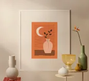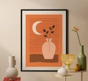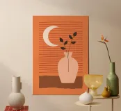 vaso luna crescente foglie sfondo a righe linee composizione minimalista ambientazione still-life toni neutri tavolozza terrosa design semplicistico forme geometriche arredamento d'interni arredamento per la casa stampa d'arte arredamento moderno elementi naturali botanico fogliame steli di piante scenario serale