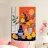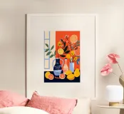 Vasi dai colori vivaci sono riempiti con piante stilizzate e agrumi di colore arancione vibrante. La composizione è caratterizzata da un mix di gialli, blu e verdi che conferiscono alla scena un'atmosfera energica e vivace.