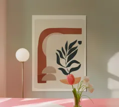 vaso foglie cerchi forme geometriche pianta botanico forme astratte forme sovrapposte forme organiche toni della terra sagome stelo elementi minimalisti colori pastello linee semplici forme naturali pianta in vaso elementi decorativi composizione di natura morta sfondo neutro