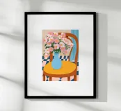 A delicate still life of pink blossoms in a blue vase on a warm-toned chair, evoking elegance and simplicity.
