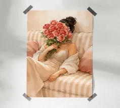 Un dipinto morbido ed elegante che cattura la tranquilla bellezza di un gesto semplice. Una donna, vestita con un fluente abito bianco, abbraccia un grande bouquet di tulipani rosa corallo - il suo volto è nascosto dietro i fiori, lasciando che siano i fiori a parlare. Lo sfondo beige tenue e la texture pittorica esaltano l'atmosfera delicata e intima. Minimalista ed emotivo, questo pezzo evoca i temi della gratitudine, della femminilità e della poesia dei momenti quotidiani, rendendolo un pezzo senza tempo per gli interni che tendono verso gli stili romantico, moderno o scandinavo.