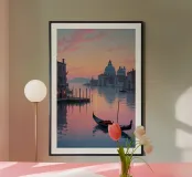 Una gondola scivola pigramente lungo la Laguna di Venezia, incorniciata da edifici secolari che risplendono nelle tonalità dorate del tramonto. Il delicato cielo rosa sfuma nell'acqua scintillante, creando una danza ipnotica di luci e riflessi. In lontananza, le cupole di Santa Maria della Salute si ergono alte, a testimonianza del ricco patrimonio culturale di Venezia. Questo dipinto a olio mozzafiato racchiude perfettamente l'eleganza senza tempo e il fascino romantico della città.