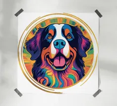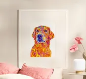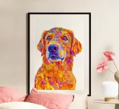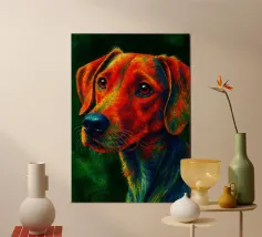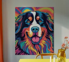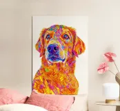 A highly detailed digital artwork of a dog featuring an abstract, multicolored design with bold strokes and vivid hues of yellow, orange, pink, and blue. The expressive eyes add depth to the composition, creating a striking and artistic effect.