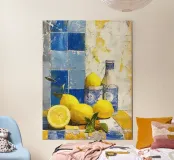 Limoni vivaci sono accostati a ceramiche bianche e blu su uno sfondo di piastrelle blu strutturate. La scena è illuminata da una luce calda che mette in risalto i ricchi toni del giallo e del blu.