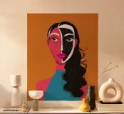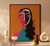 Un suggestivo ritratto astratto di un volto di donna, diviso in due metà, una nera e una bianca, con labbra rosse e capelli fluenti su un caldo sfondo arancione.