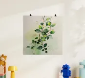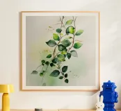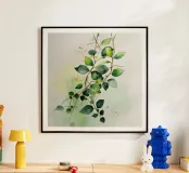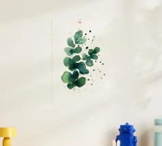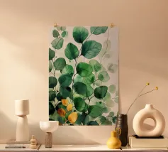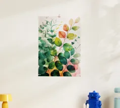 Un elegante acquerello che raffigura un fogliame verde a cascata su steli sottili e tortuosi. Le foglie variano di tonalità dal verde intenso della foresta al verde-giallo fresco, accentuate da morbide pennellate di menta e oro pallido. Le linee organiche e fluide e i sottili schizzi creano un senso di movimento e di luce, evocando un'atmosfera pacifica e botanica.