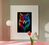 Una testa di volpe stilizzata con i colori dell'arcobaleno è il punto focale di questa grafica espressiva. La metà sinistra del volto risplende in colori caldi come il rosso, l'arancione e il viola, mentre il lato destro è caratterizzato da tonalità fredde di blu e verde. I colori scorrono dinamicamente verso il basso e creano un intenso effetto di gocciolamento che ricorda la vernice liquida. Lo sfondo è di un nero intenso, che fa risaltare in modo particolare i colori vivaci. Lo sguardo della volpe è diretto e intenso e conferisce al quadro un'affascinante espressività.