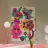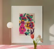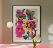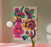 Una composizione astratta con un volto rosa con gli occhi chiusi, circondato da fiori e uccelli colorati. Gli elementi sono disposti in modo stravagante e surreale.