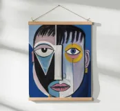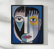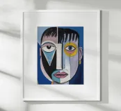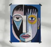 Questa opera d'arte presenta un volto geometrico astratto con linee decise e un mix di colori blu, giallo e verde. Lo sfondo è pieno di forme geometriche, che si aggiungono al tema astratto generale.