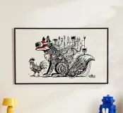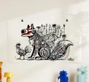 Volpe VR e la sua gallina, stile graffiti, stile urbano, arte da parete, natura, organico ed elettronico/meccanico. Da un disegno unico originale dipinto a mano dall'artista francese Shag con sede ad Annecy, Francia. Originariamente dipinto con acrilico su tavola di legno.