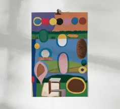 Quadro astratto con una vibrante composizione di forme e colori. Lo sfondo è una miscela strutturata di tonalità verdi che crea un'illusione di profondità. Sulla tela sono sparsi audaci cerchi arancioni, alcuni pieni e altri con i soli contorni, che contrastano nettamente con il verde. Intermittenti tratti rosa aggiungono calore alla scena, mentre le linee tratteggiate viola danno un ritmo giocoso. Alcuni cerchi grigi solitari sembrano fluttuare in questo paesaggio onirico. Quest'opera d'arte evoca un senso di estrosità grazie all'uso di giustapposizioni di colori e di forme geometriche varie.