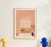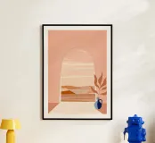 Un arco che conduce a un paesaggio desertico con montagne in lontananza. La scena è minimalista con colori tenui come il beige, il rosa e il marrone, che creano un'atmosfera serena e pacifica.