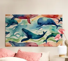 Tante balene colorate disegnate a mano e immerse nell'acqua con pesciolini e bolle.
