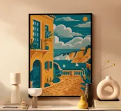 Illustrazione di una donna che cammina lungo un sentiero in una colorata cittadina della Costiera Amalfitana, con una splendida vista sul mare e sulle barche a vela. La scena cattura la bellezza, il romanticismo e l'avventura di una perfetta vacanza italiana.