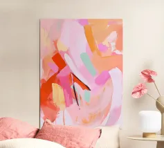 Quest'opera astratta si compone di gesti ampi e stratificati nei colori corallo, rosa fard, pesca tenue e sprazzi di menta e giallo pallido. I colori fluiscono l'uno nell'altro con una luminosa morbidezza, creando un senso di movimento senza urgenza. I toni più caldi dell'arancio e del rosso ancorano la composizione, mentre i passaggi più leggeri introducono aria e apertura, permettendo alla superficie di respirare.
