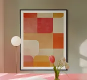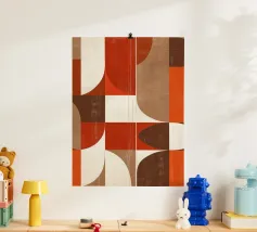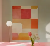 Questa composizione astratta esplora l'armonia attraverso la sovrapposizione di forme geometriche e una tavolozza calda di ispirazione vintage. I rettangoli arrotondati si intersecano dolcemente, creando trasparenze stratificate che suggeriscono movimento e profondità senza una struttura rigida. I toni della terracotta, del corallo, dell'ocra, del crema tenue e dell'oro tenue evocano il design moderno della metà del secolo scorso, pur rimanendo freschi e contemporanei. La sottile texture superficiale aggiunge una qualità tattile, bilanciando precisione e calore. L'opera d'arte riflette un ritmo e un equilibrio tranquilli, rendendola un pezzo raffinato per interni moderni, minimalisti o di ispirazione rétro.