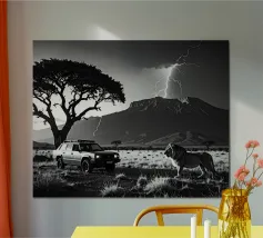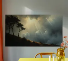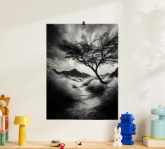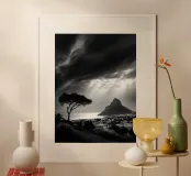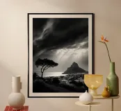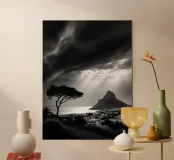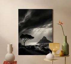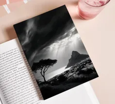 A striking black and white landscape where rays of light cut through dramatic clouds. This artwork conveys strength, depth, and quiet awe.