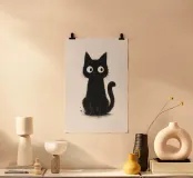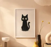 Un piccolo gattino nero siede in posizione eretta con una postura vigile e curiosa, i suoi occhi bianchi sovradimensionati gli conferiscono un'espressione luminosa e accattivante. La pelliccia è resa con texture morbide e color inchiostro e sottili dettagli splatter, creando un fascino dipinto a mano e leggermente disordinato. La coda si arriccia delicatamente di lato e lo sfondo bianco e pulito fa risaltare la silhouette scura e i tratti espressivi con una chiarezza semplice e stravagante.