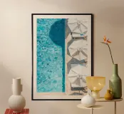 Questa serena veduta aerea cattura la tranquilla bellezza di un rifugio a bordo piscina. L'acqua cristallina e turchese riflette il calore del sole, creando un rilassante effetto di increspatura che attira lo sguardo. Ombrelloni bianchi fiancheggiano il bordo, offrendo ombra e comfort, mentre i toni morbidi e terrosi delle piastrelle evocano un senso di eleganza senza sforzo. Questo pezzo invita ad abbandonarsi alla pace e al lusso dei momenti a bordo piscina, aggiungendo un tocco di tranquilla raffinatezza a qualsiasi spazio moderno. Perfetto per chi cerca relax e raffinatezza nell'arredamento della propria casa.