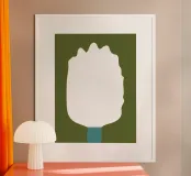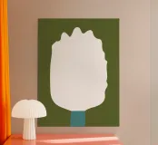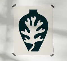 Il design minimalista è caratterizzato da una forma stilizzata di albero bianco con una base verde acqua. La forma astratta spicca e cattura l'attenzione con la sua semplicità e i suoi colori contrastanti.