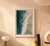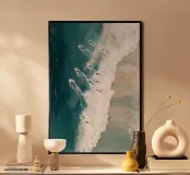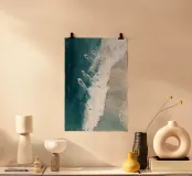 Quest'opera d'arte cattura il ritmo dinamico dell'oceano attraverso una prospettiva dall'alto verso il basso, in cui i surfisti si fanno strada attraverso un'onda potente e spumeggiante. Il contrasto tra il blu intenso dell'acqua, il bianco lattiginoso delle onde e le sfumature sabbiose crea un flusso visivo sorprendente, che sembra allo stesso tempo energico e meditativo. Le texture pittoriche ammorbidiscono il movimento, trasformando un momento fugace in una composizione astratta di movimento ed equilibrio. L'opera esplora il rapporto tra la scala umana e la forza naturale, rendendola ideale per interni contemporanei, spazi costieri e stampe artistiche di grande formato.