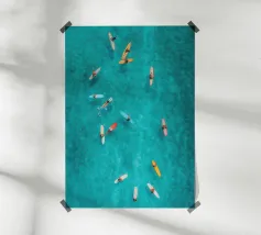 This artwork captures the dynamic rhythm of the ocean through a top-down perspective, where surfers carve through a powerful, foaming wave. The contrast between deep blue water, milky white surf, and sandy undertones creates a striking visual flow that feels both energetic and meditative. Painterly textures soften the motion, transforming a fleeting moment into an abstract composition of movement and balance. The piece explores the relationship between human scale and natural force, making it ideal for contemporary interiors, coastal spaces, and large-format fine art prints.
