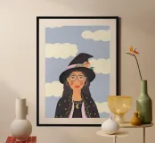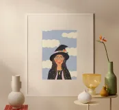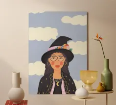 Scopri un'affascinante stampa artistica incorniciata in legno che rappresenta una strega elegante con un cappello caratteristico e un cielo blu. Questo pezzo unico è ideale per arredare la tua casa o come regalo speciale per gli amanti delle arti.