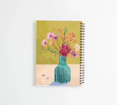 Suggestiva natura morta dai colori estivi, con un bel bouquet di fiori di campo in un moderno vaso a righe. I colori caldi danno la sensazione di trovarsi immediatamente in un paese mediterraneo.
