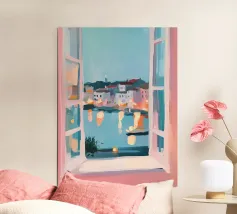 The view through a window reveals a colorful city with red and blue buildings, creating a sense of looking out from a quiet interior into a vibrant world.