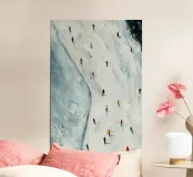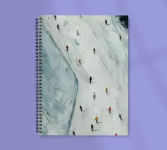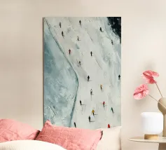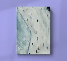 Quest'opera d'arte raffigura una prospettiva aerea dinamica di sciatori dispersi su un campo di neve luminoso, dipinto con pennellate espressive e strutturate. Il contrasto tra l'ampia superficie bianca e i vividi accenti di rosso, arancione e verde crea un senso di ritmo e movimento. Ogni figura lascia una traccia sottile, suggerendo sia l'individualità che il flusso collettivo. La composizione trasforma una semplice scena invernale in una meditazione astratta sul movimento, lo spazio e la presenza umana, evocando energia calma, equilibrio e la bellezza fugace dell'attività invernale.