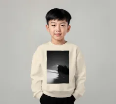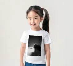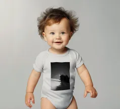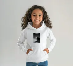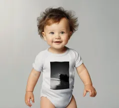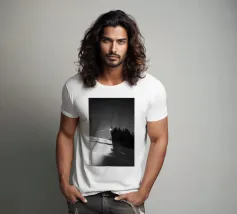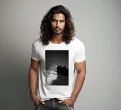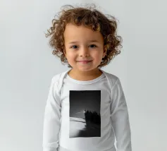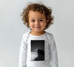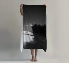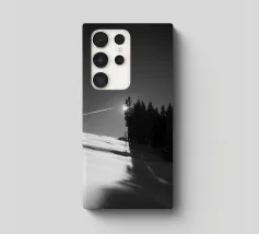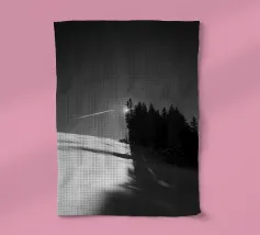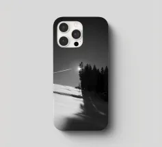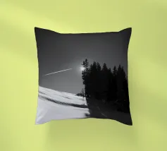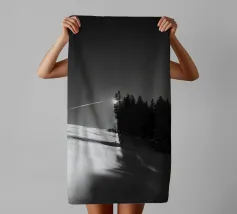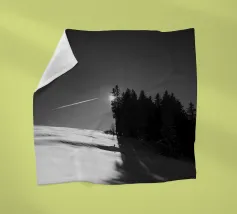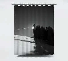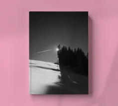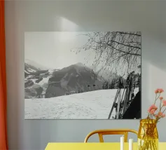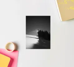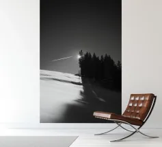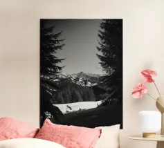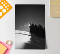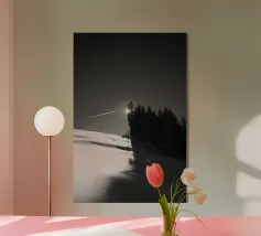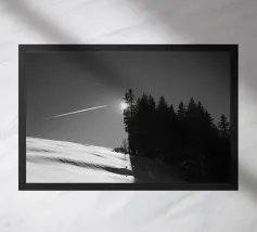 Una tranquilla fotografia in bianco e nero che cattura la luce del sole che attraversa una fitta foresta, proiettando lunghe ombre su una collina incontaminata e innevata. Un'aggiunta minimalista e senza tempo alla vostra parete.