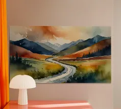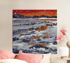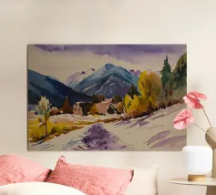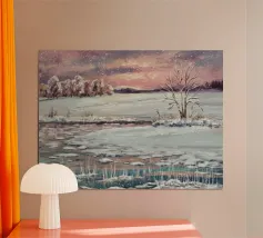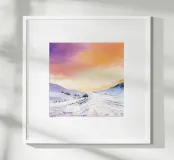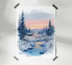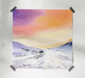 Paesaggio invernale acquerellato al tramonto in arancione, rosa e viola