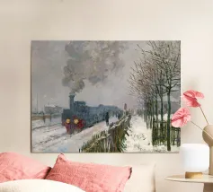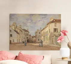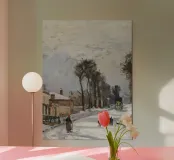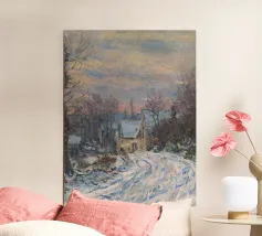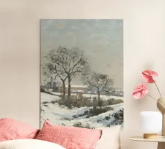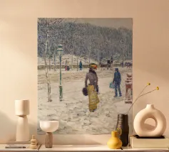 This poetic winter landscape with a village street shows a snow-covered avenue, people walking and a horse-drawn carriage in the snow against a gentle winter sky. The soft grey, beige and white tones lend the scene a nostalgic winter aesthetic full of tranquillity. The rural winter idyll combines a village scene in winter, a romantic snowy landscape, vintage landscape painting, European winter art and timeless nature illustration. Perfect as a winter mural, art for the living room, cosy home decor, country house style decoration, gift for art lovers and atmospheric winter decoration.