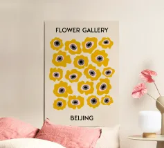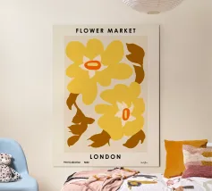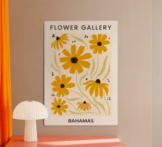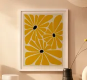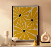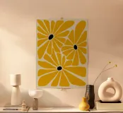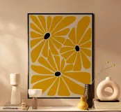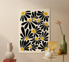 Audaci petali gialli disposti in modo simmetrico creano un disegno floreale di grande effetto. I centri neri aggiungono un punto focale di contrasto, esaltando la vivacità della composizione.