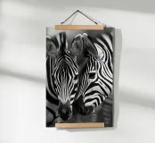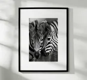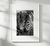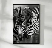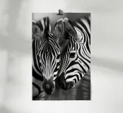 Questa intima fotografia in bianco e nero di due zebre emana pura tenerezza: le loro teste sono amorevolmente accoccolate. L'immagine monocromatica rafforza l'effetto grafico delle iconiche strisce e ricorda le classiche fotografie naturalistiche di Ansel Adams. La messa a fuoco morbida sullo sfondo attira l'attenzione sul legame emotivo tra gli animali. Un motivo senza tempo che si adatta a interni sia moderni che classici, perfetto per chi apprezza la bellezza naturale e l'armonia al limite dell'astrazione grafica.