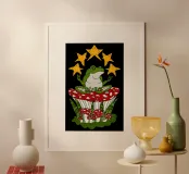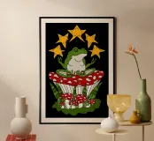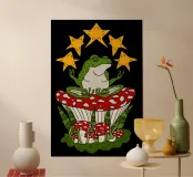 Zen frog sitting on red mushroom with golden stars. Everyone has their own interpretation of this design so I'll leave it up to you. Excellent gift and decor for dorm room or bedroom wall.