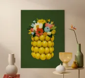 Questa illustrazione acrilica minimalista mostra un moderno vaso di limoni riempito con un colorato bouquet di fiori e piante fresche. Su uno sfondo verde, la forma rotonda del vaso sottolinea i colori armoniosi del giallo, dell'arancione e dell'azzurro. Un accento fresco e botanico per ogni casa!