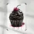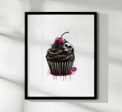 Un cupcake nero con glassa lucida è decorato con un teschio, zuccherini rosa e una ciliegia rossa. La combinazione di estetica dark e dolcezza crea un sorprendente contrasto tra stile gotico e cultura pop.