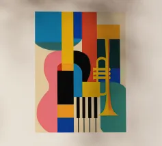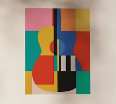 Un moderno dipinto astratto con forme geometriche che formano chitarre, violini e note musicali in una composizione audace e colorata. Lo sfondo strutturato e la disposizione dinamica evocano un senso di ritmo e di espressione artistica.