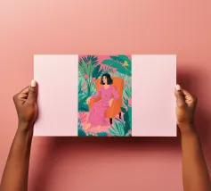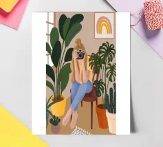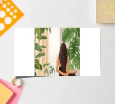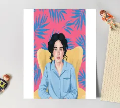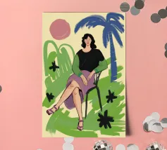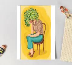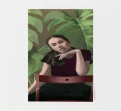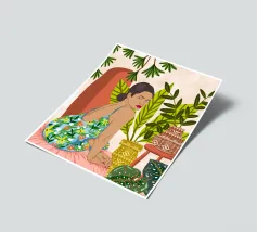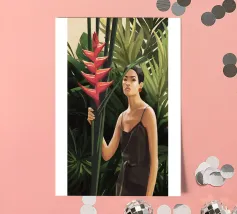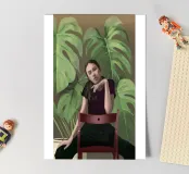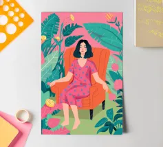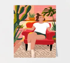 Ritratto di una donna seduta su una sedia rossa, incorniciata da grandi e rigogliose foglie di monstera. La sua posa riflessiva e la sua espressione calma evocano un senso di introspezione e chiarezza. I toni morbidi e terrosi e gli elementi naturali fondono il minimalismo moderno con la bellezza botanica, rendendo quest'opera d'arte perfetta per gli interni contemporanei.