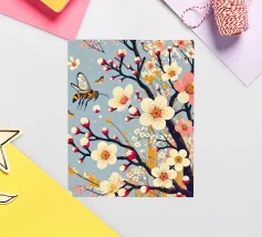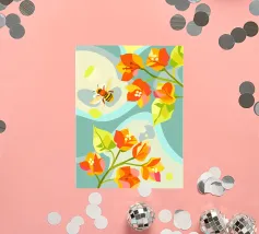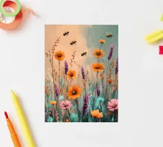 Il disegno dettagliato presenta una varietà di fiori vivaci visitati da api indaffarate.