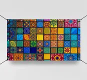 Le tessere dai colori vivaci presentano una serie di motivi intricati in varie tonalità, creando un mosaico straordinario. L'opera d'arte presenta disegni floreali e geometrici in una composizione vivace.