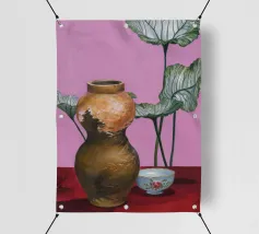 Una vivace natura morta mostra una collezione di vasi colorati (viola, blu, a righe), ciotole e oggetti decorativi disposti ad arte sul piano di un tavolo giallo brillante contro una parete segmentata rosa e verde.