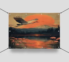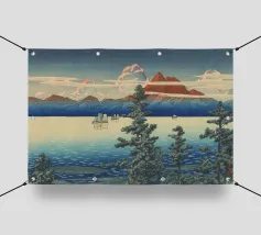 Una xilografia con foglie di loto e ninfee sulla riva, con il sole che tramonta in un cielo rosa pallido su un lago calmo. Sullo sfondo si intravede un'isola all'orizzonte, circondata da alberi e montagne lontane. Quest'opera incarna l'estetica del periodo Edo e mostra la semplicità delle tecniche xilografiche e la calma dei colori.
